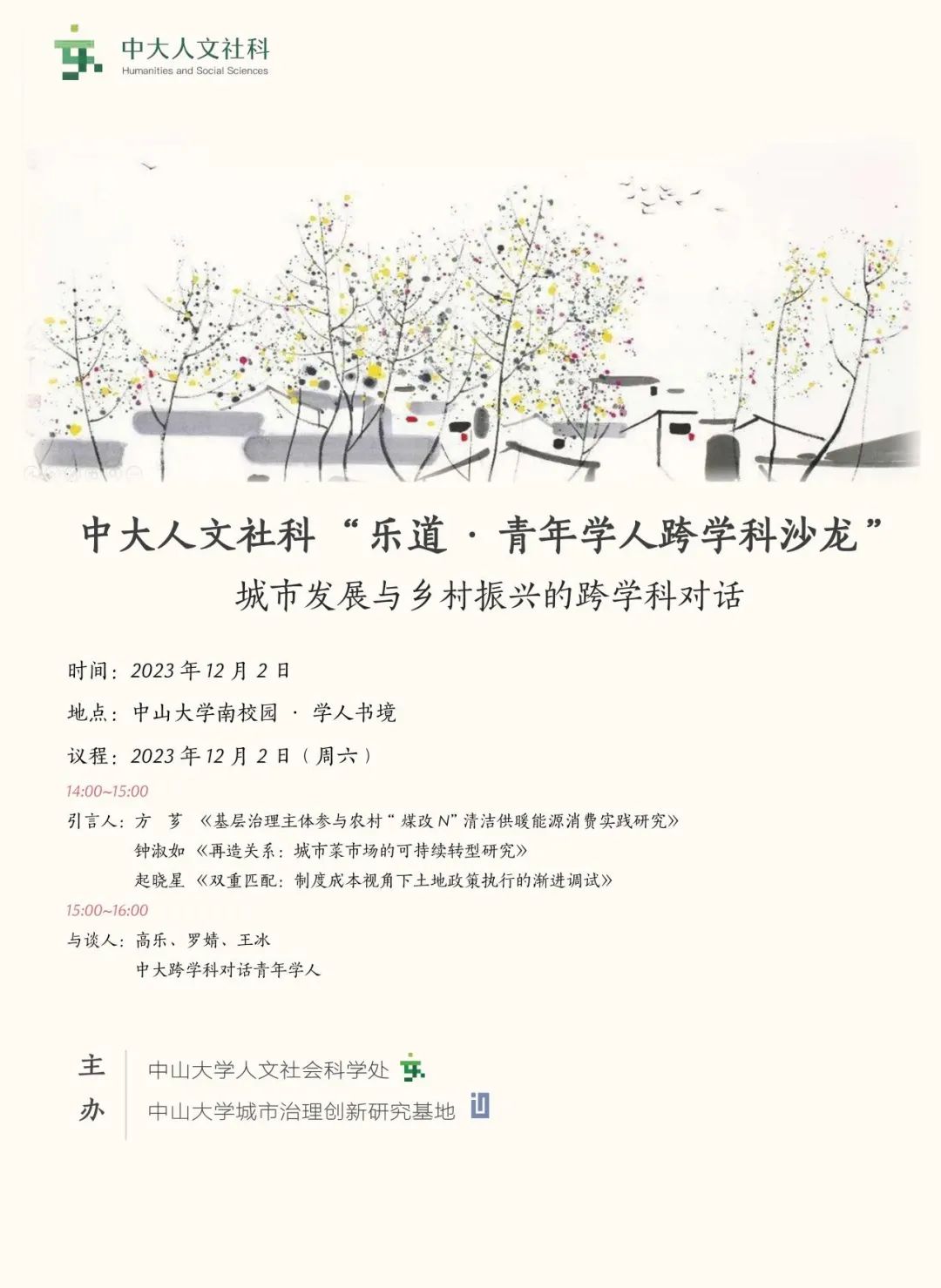 为深入推动中大人文社科青年学人的跨学科交流,12月2日,我校人文社会科学处与城市治理创新研究基地在南校园学人书境联合主办首期中大人文社科“乐道·青年学人跨学科沙龙。该系列活动旨在通过“有组织科研”实现跨学科思想交流与成果产出,助力青年学人跨领域深度探讨,鼓励探索未知、拓展视野,促进学校哲学社会科学高质量内涵式发展。