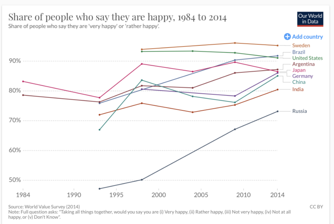 我想谈的跟“幸福感”相关的第二个概念,就是“经济水平”。经济水平和幸福感的关系是很复杂的,比如中国的经济水平近三十年来是不断提升的,人们报告幸福的百分比在1994年时低于70%,到现在已经到85%左右,而且这个幸福感的提升与经济水平提升肯定是有关系的。但是,你看瑞典的数据,你会发现上世纪九十年代到现在他们的幸福感基本是没有变化的。所以,对于一个地区来说,经济水平提升到一定水平后,幸福感其实就不太受到经济水平的影响了。对此我的解读是,有钱之前我们追求的是经济收入的提升,但是有一定的经济基础之后,我们就开始追求生活方式的改变了,更多憧憬的是对美好生活的需要。