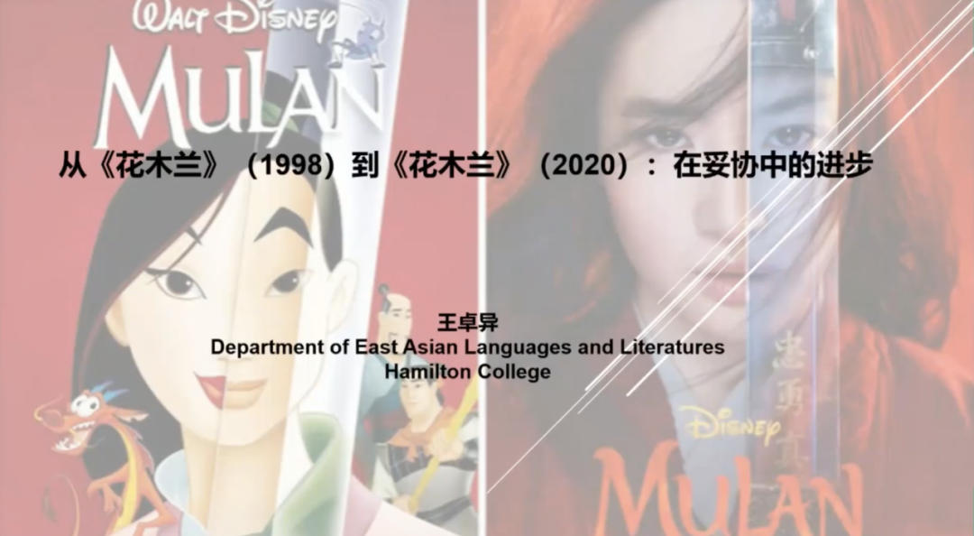 讲座以1998年迪士尼公司拍摄的动画片《花木兰》中系统性的时间错置与地点错置引入,关注1998年原版动画片与2020年真人版影片的差别。王卓异老师通过细致而敏锐的观影,指出重要的不是电影中文化与历史的细节是否完全准确,而是改编背后的动机和目的。