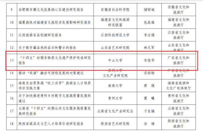 近日,文化和旅游部公布了文化和旅游部社科研究优秀成果推介展示活动(2021—2023)名单,我校中国非物质文化遗产研究中心主任宋俊华教授荣获行业智库成果奖。