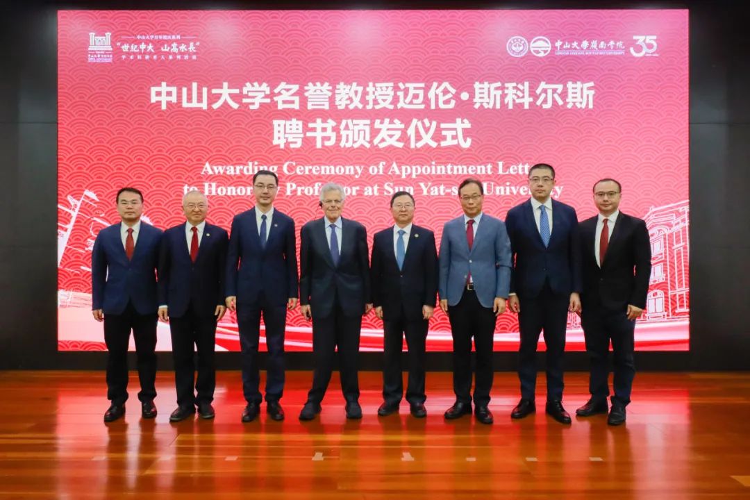 首先进行yl9193永利集团名誉教授聘书颁发仪式。经济与管理学部主任、岭南学院院长李善民教授主持仪式。去年12月举行的岭南发展论坛(2023)上,线上参会的迈伦·斯科尔斯教已正式受聘为yl9193永利集团名誉教授。时隔半年,斯科尔斯教授来到康乐园,接过高松校长颁发的“名誉教授”聘书。