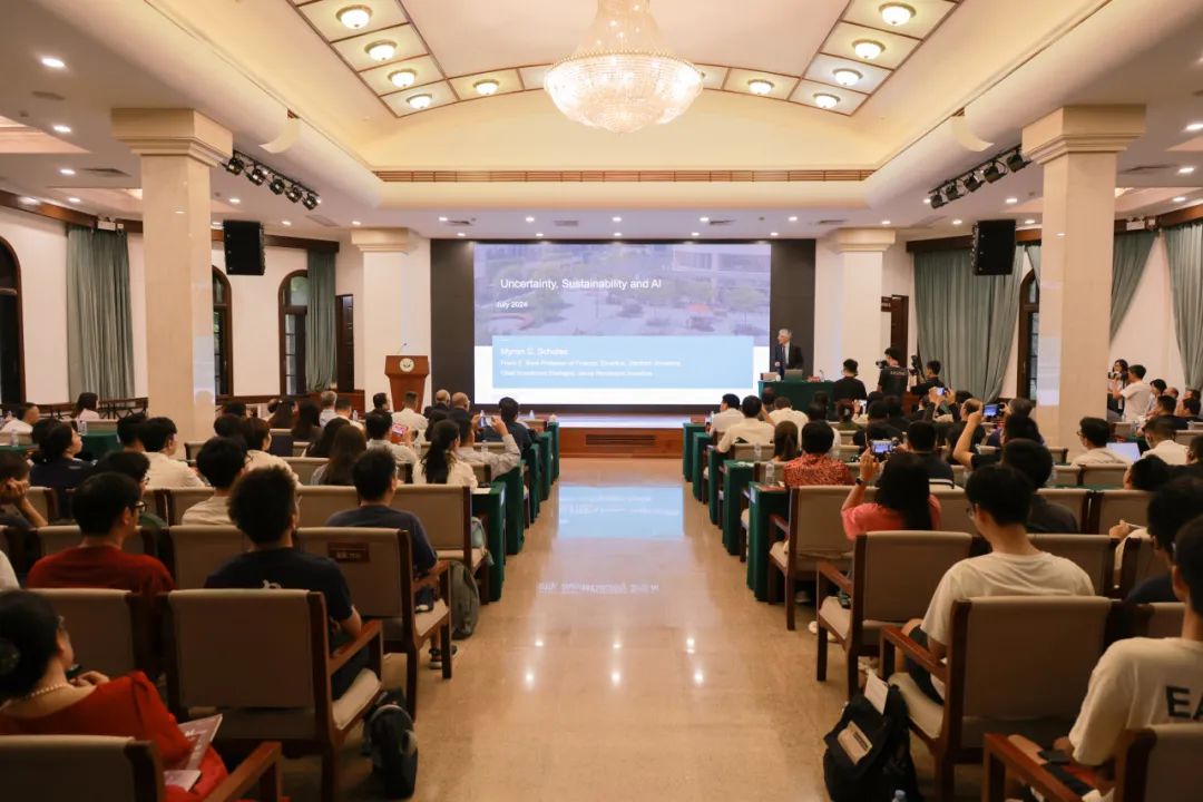 随后,迈伦·斯科尔斯教授围绕“不确定性、人工智能与脱碳”的主题进行学术演讲。yl9193永利集团国家发展研究院院长、吴小兰讲席教授赵昌文主持此次讲座。