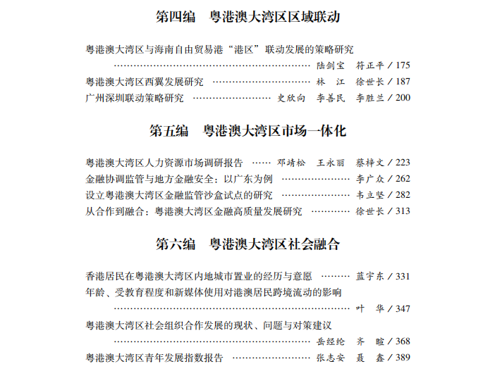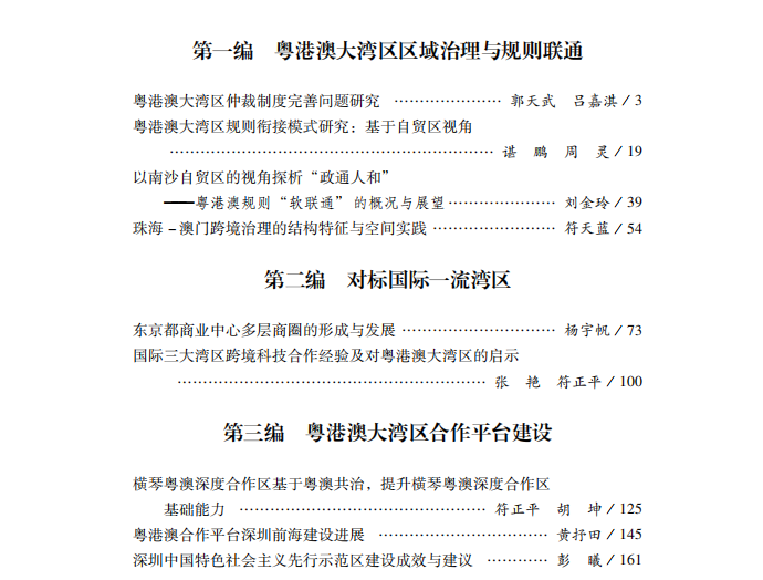 本研究报告的成果聚焦于六个方面:粤港澳大湾区区域治理与规则联通、对标国际一流湾区、粤港澳大湾区合作平台建设、粤港澳大湾区区域联动、粤港澳大湾区市场一体化和粤港澳大湾区社会融合。在继续坚持理论研究与政策研究相结合、扩大时空范围和多学科合作研究的基本原则的同时,本研究报告在延续前期主题的同时,重点突出了三个新的主题,即区域治理与规则联通、对标国际一流湾区和粤港澳大湾区合作平台建设。相关研究成果也在一定程度上折射出大湾区建设过程中的前沿领域。