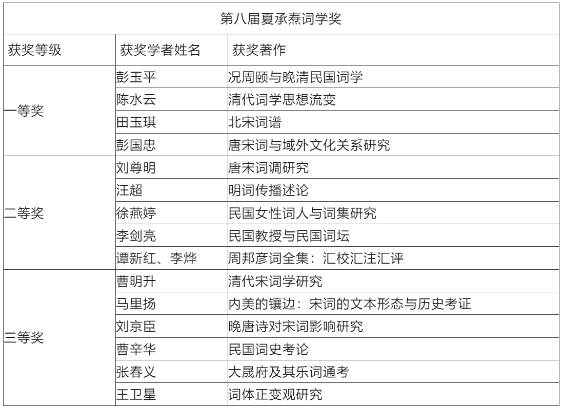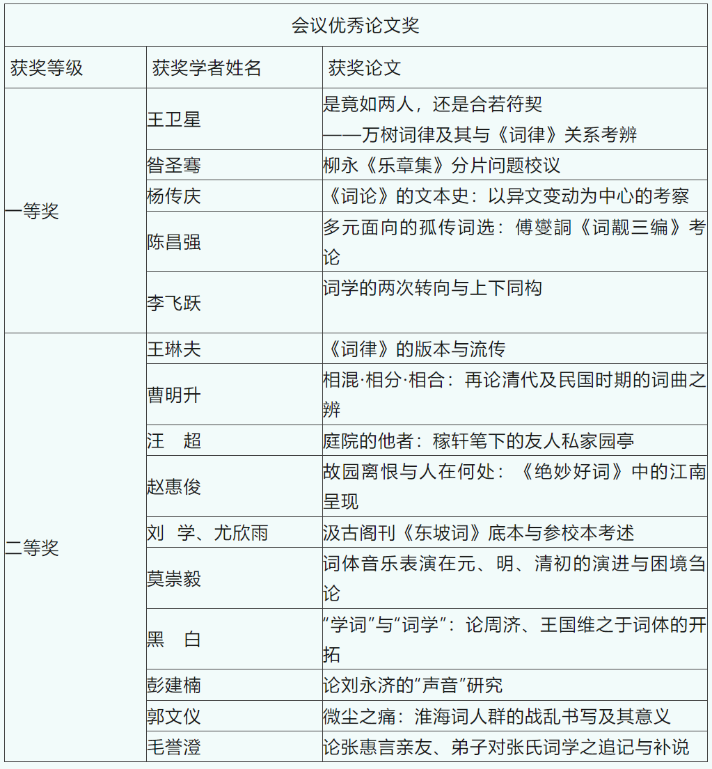 第八届夏承焘词学奖的颁奖在大会闭幕式上进行。夏承焘词学奖是国内词学界的最高奖,每三至五年评选一次,本届有15部作品获得这一荣誉,其中一等奖4部、二等奖5部、三等奖6部。本次参会论文的评优倾向中青年学者,共15篇论文被评为本次会议的优秀学术论文。