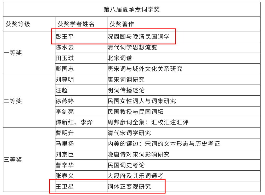 8月25日,第八届夏承焘词学奖的颁奖在第十一届中国词学研究会年会闭幕式上进行。夏承焘词学奖是国内词学界的最高奖,每三至五年评选一次,本届有15部作品获得这一荣誉,一等奖4部、二等奖5部、三等奖6部。其中,我校中国语言文学系彭玉平教授的作品《况周颐与晚清民国词学》、王卫星副教授的作品《词体正变观研究》分别获得一等奖和三等奖。