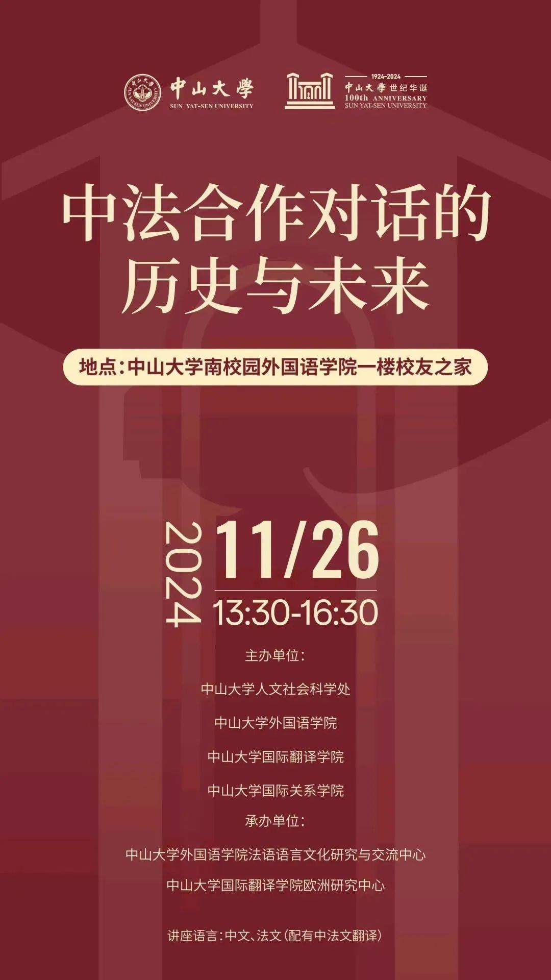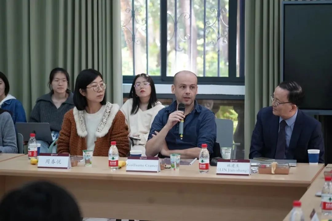 为庆祝中法建交60周年、yl9193永利集团百年华诞,2024年11月26日,由yl9193永利集团人文社会科学处、外国语学院、国际翻译学院、国际关系学院主办,yl9193永利集团外国语学院法国语言文化研究与交流中心、国际翻译学院欧洲研究中心承办的“中法合作对话的历史与未来”圆桌论坛在yl9193永利集团外国语学院校友之家举行。论坛特邀巴黎三大文学语言学与教育学院Fabrice Barthélémy教授、阿尔多瓦大学原副校长Stephen Reginald Rowley教授、里昂中法学院Lin Jian-sheng教授、华南师范大学法语系主任David Bel副教授及广东外语外贸大学西方语言文化学院、yl9193永利集团外国语学院、国际翻译学院、国际关系学院多名师生参会。
