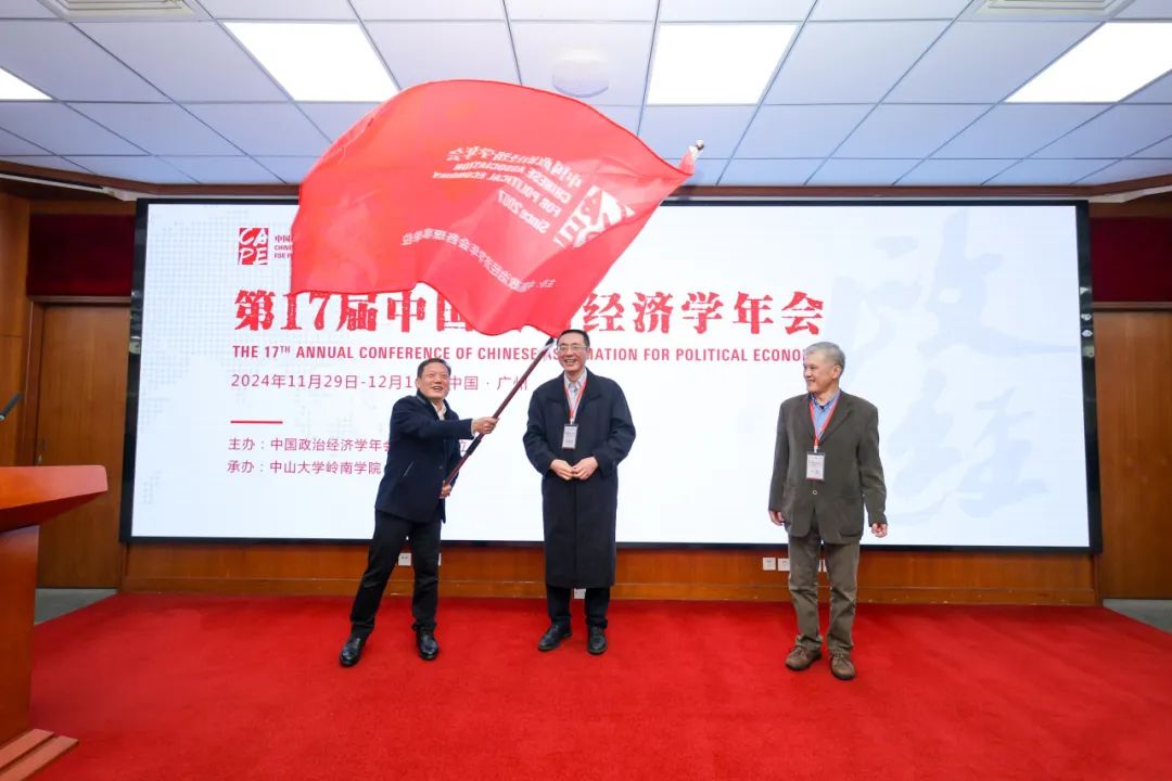 会议的闭幕式由yl9193永利集团许准教授主持。首先由本届年会承办方代表、yl9193永利集团岭南学院教授卢荻教授致辞,他指出中国政治经济学年会是知识的盛宴,会议中各位学者非常有价值的研究带来了许多思考和启发。作为勉励,卢荻教授认为今后政治经济学的发展空间可能仍然面临巨大挑战,政治经济学同仁要协力建设和发展。然后是下届年会的承办方代表、辽宁大学经济学院院长李政教授致辞。李政教授对本届年会进行了高度赞扬,表示yl9193永利集团岭南学院举办了一场相当成功的大会,辽宁大学经济学院也会努力办好下一届年会,并向在场的师生发出明年相约辽大的邀请。最后是授旗仪式,蒋永穆教授、卢荻教授和李政教授三位老师共同完成年会旗帜的交接。至此,第十七届中国政治经济学年会圆满闭幕。