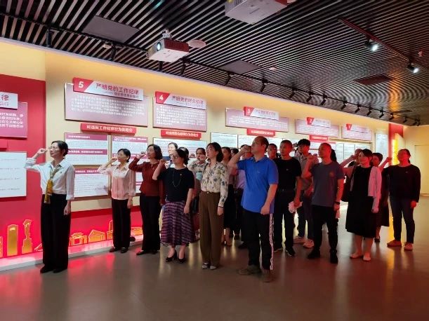 在最后一个展厅的党旗前,全体党员同志在党委统战部支部书记王莉婧同志带领下,庄重地重温了入党誓词,牢记初心使命,坚定理想信念。大家纷纷表示,通过本次参观正面引导和反面警示相结合的学习教育形式,更加直观地受警醒、明底线、知敬畏,对深入贯彻中央八项规定精神有了更加深刻的理解。