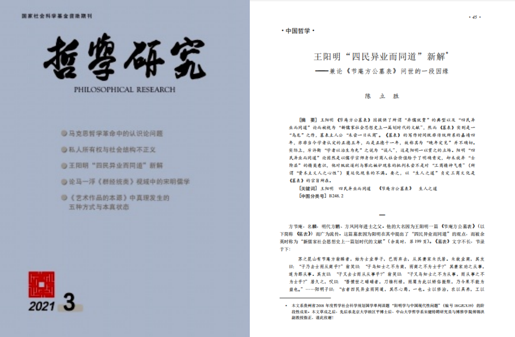 王阳明在《节庵方公墓表》一文中提出了“四民异业而同道”的观点,被余英时称为“新儒家社会思想史上一篇划时代的文献”。本文一方面详细考察了这一重要文献之写作的来龙去脉,对现行考证提出商榷,重新确定了其写作缘起和时间;另一方面阐述了王阳明“四民异业而同道”论虽是以儒学宗师身份对商人社会价值给予了明确肯定,但却未放弃“士阶层”的精英意识,以“生人之道”贞定工商文化是此文的宗旨所在。截止目前,本文发表后在中国知网被引10次,在《哲学研究》公众号上阅读量超过2000,并被儒家网等公众号转载。