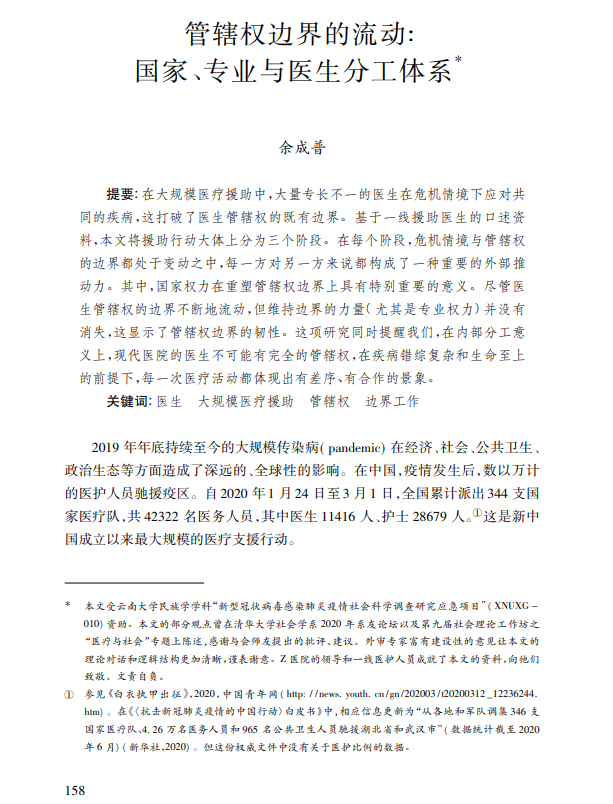在大规模医疗援助中,大量专长不一的医生在危机情境下应对共同的疾病,这打破了医生管辖权的既有边界。基于抗疫一线援助医生的口述资料,论文将援助行动大体上分为三个阶段。在每个阶段,危机情境与管辖权的边界都处于变动之中,每一方对另一方来说都构成了一种重要的外部推动力。其中,国家权力在重塑管辖权边界上具有特别重要的意义。尽管医生管辖权的边界不断地流动,但维持边界的力量(尤其是专业权力)并没有消失,这显示了管辖权边界的韧性。这项研究同时提醒我们,在内部分工意义上,现代医院的医生不可能有完全的管辖权,在疾病错综复杂和生命至上的前提下,每一次医疗活动都体现出有差序、有合作的景象。