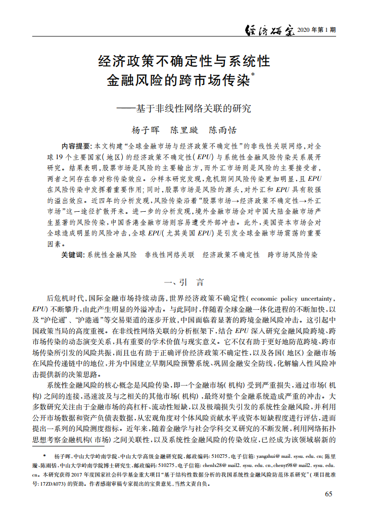 本文将最新发展的前沿网络分析方法与非线性因果检验方法结合起来,构建“全球金融市场与经济政策不确定性”的非线性关联网络,对全球19个主要国家(地区)的经济政策不确定性(EPU),与系统性风险传染关系展开深入研究。