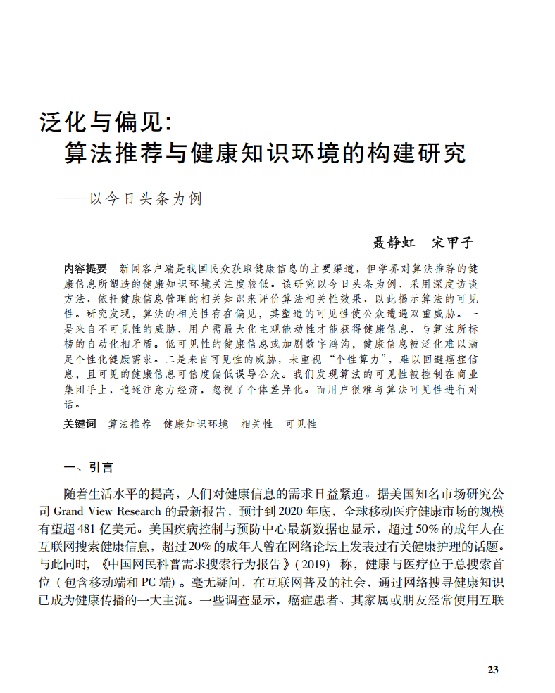 泛化与偏见:算法推荐与健康知识环境的构建研究——以今日头条为例