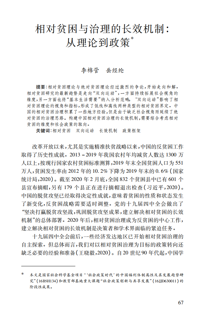 在学术上,该文关于相对贫困实质内核的提炼、双向运动趋势的归纳和相对贫困类型学的建构具有推进意义;在实践上,该文为脱贫攻坚战胜利收官以后的相对贫困治理提供了政策参考。