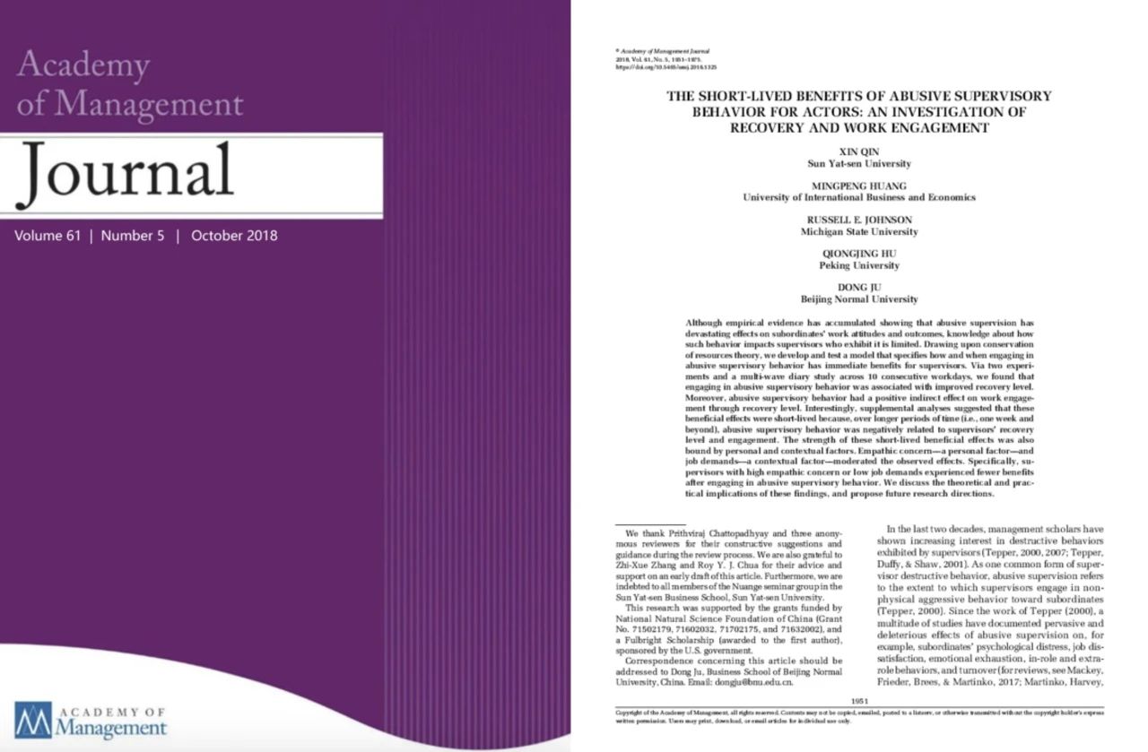 成果名称:The Short-lived Benefits of Abusive Supervisory Behavior for Actors: An Investigation of Recovery and Work Engagement