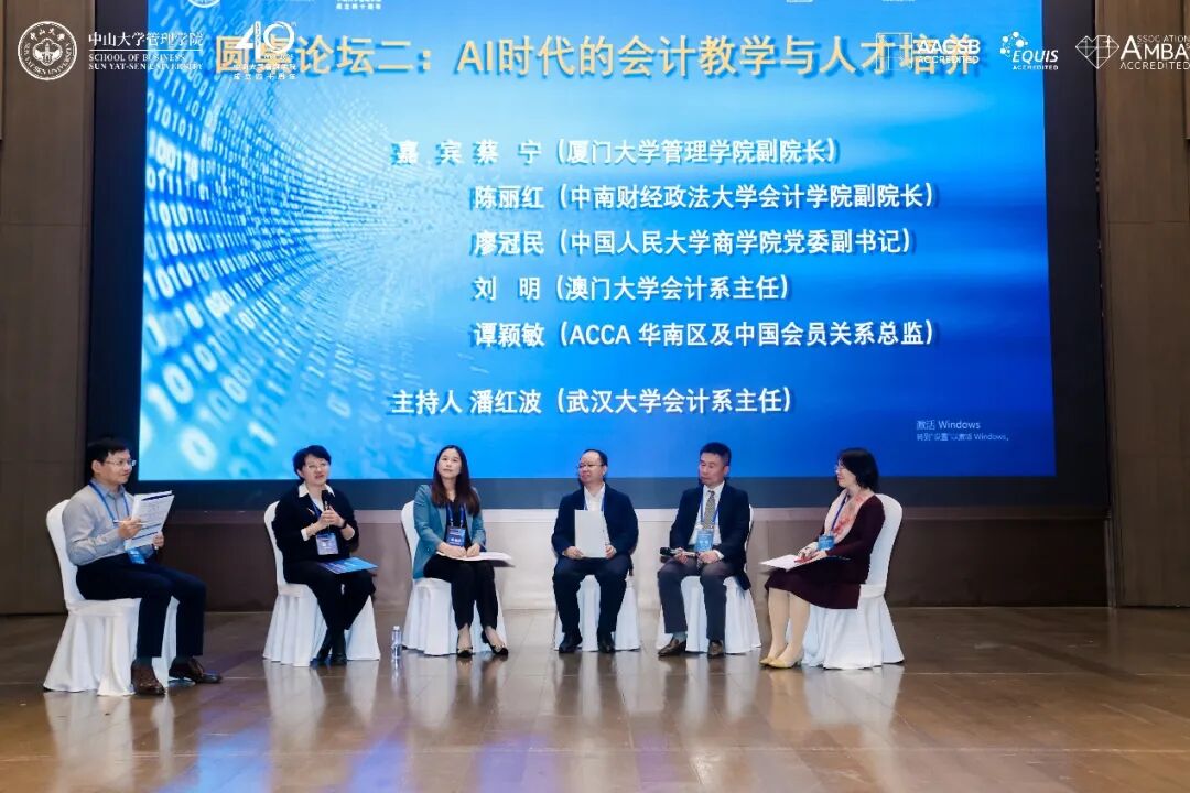 下午场的圆桌论坛环节由武汉大学会计系主任潘红波主持,厦门大学管理学院副院长蔡宁,中南财经政法大学会计学院副院长陈丽红、中国人民大学商学院党委副书记廖冠民、澳门大学会计学系主任刘明、ACCA华南区及中国会员关系总监谭颖敏围绕“AI时代的会计教学与人才培养”分享了独到见解,为未来的课程设计与学科调整指明方向。