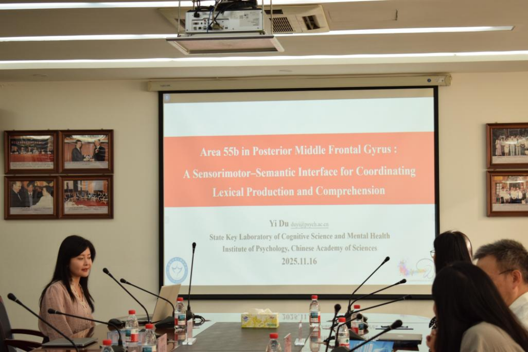 国家优秀青年科学基金获得者、中国科学院心理研究所杜忆研究员作“额中回后部55b区:跨模态词汇加工的感知运动-语义接口”)的报告。她发现,55b区作为一个接口区域,在词汇产生和理解过程中连接了语言网络与感觉运动网络,以实现感知运动-语义的协同。该区域能够区分产生与感知任务,支持语义编码,还可能是词汇加工网络中接收和发送信息的中心枢纽。