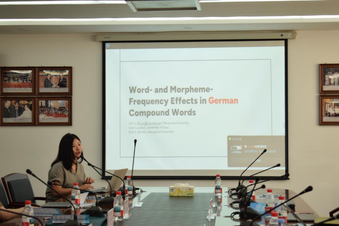 澳大利亚麦考瑞大学心理学院高级讲师余莉莉博士报告了德语复合词阅读的研究,并发现,复合词频率、初始成分频率和词长之间的交互作用,为整体词汇及其成分的互动加工提供了支持。与汉语阅读的发现不同,德语复合词的加工未显示出明显的词频对眼跳行为的影响,仅高频短复合词比低频短复合词更容易被跳过。